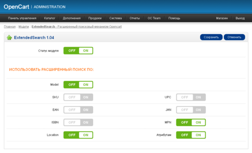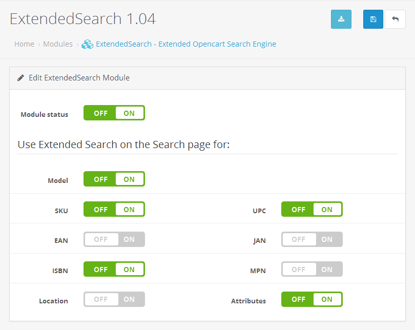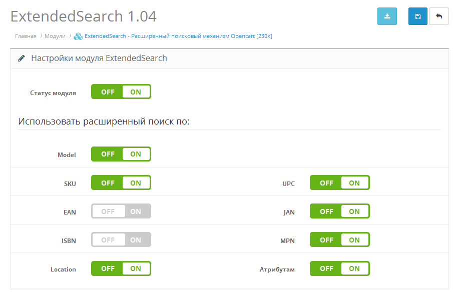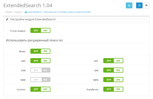 При активированном модуле на странице поиска будут показаны товары с частичным совпадением запроса в полях Model, SKU, EAN, JAN, ISBN, MPN, Location и в атрибутах.