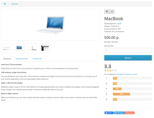 Модуль выводит рейтинг в расширенном виде в карточке товара, скрывая стандартный вид.