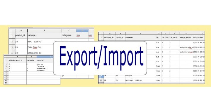 Инструмент импорта/экспорта позволяет администратору выполнять массовый экспорт категорий, продуктов, опций, атрибутов, фильтров и клиентов в файл электронной таблицы Excel. Файл электронной таблицы можно редактировать в автономном режиме, а затем повторно импортировать в базу данных OpenCart.