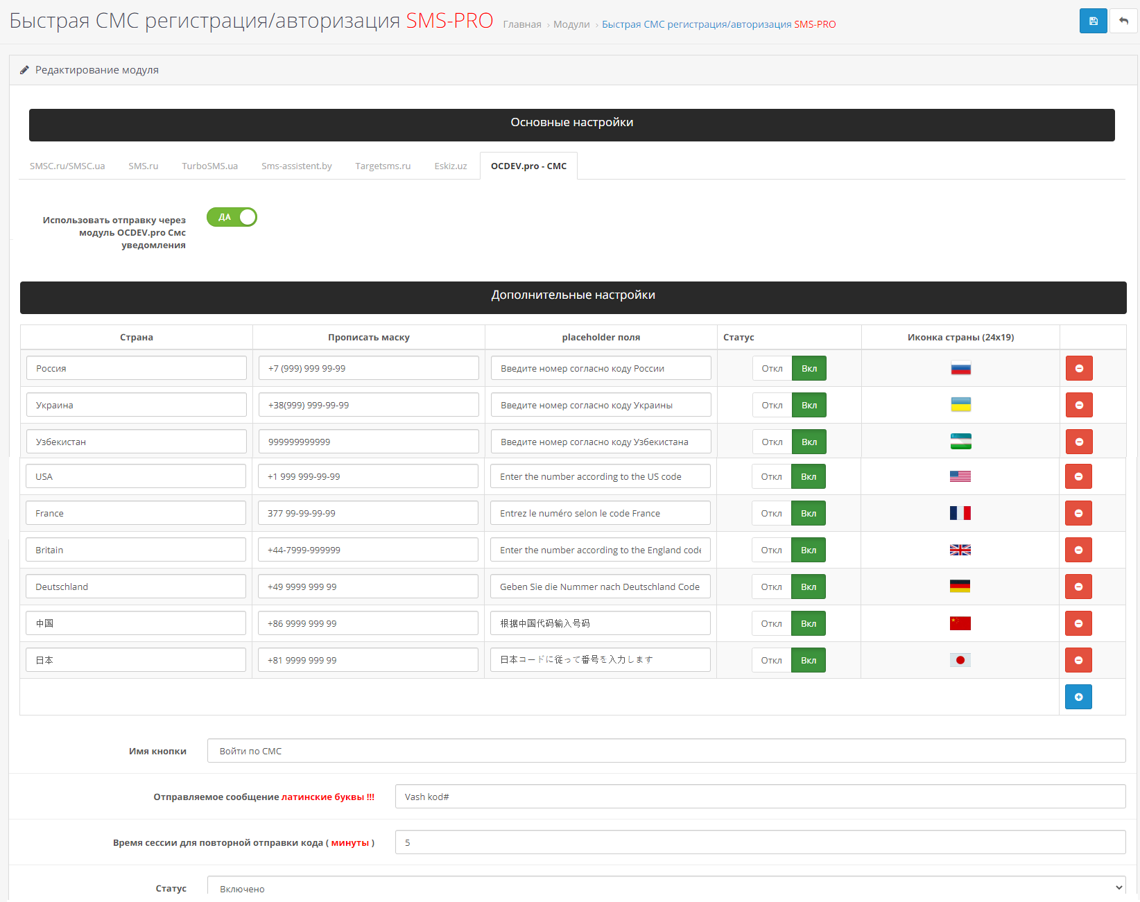 Произведена адаптация и использование шлюзов с модулем OCDEV.pro СМС уведомления для Opencart