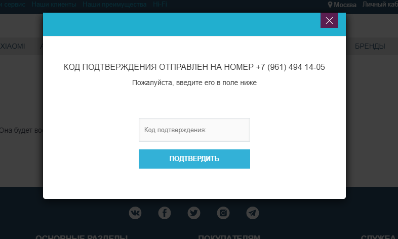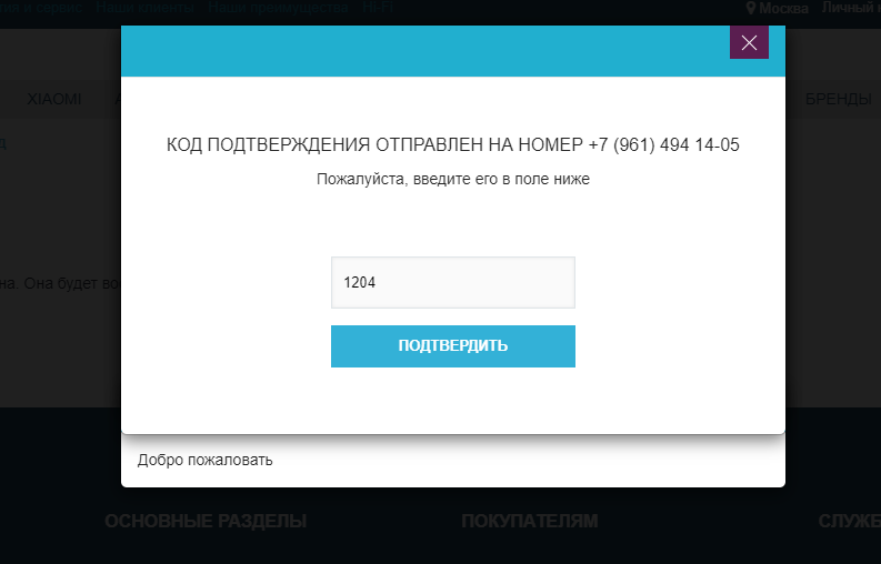 После ввода кода подтверждения происходит проверка введенного кода в поле, после успешной проверки клиент авторизовывается, либо регистрируется на сайте, перейдя в личный кабинет.