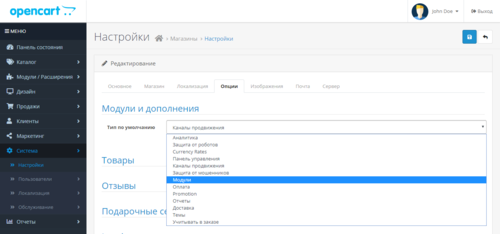 Система -> Настройки -> Настройки магазина -> вкладка Опции -> параметр Модули и дополнения
