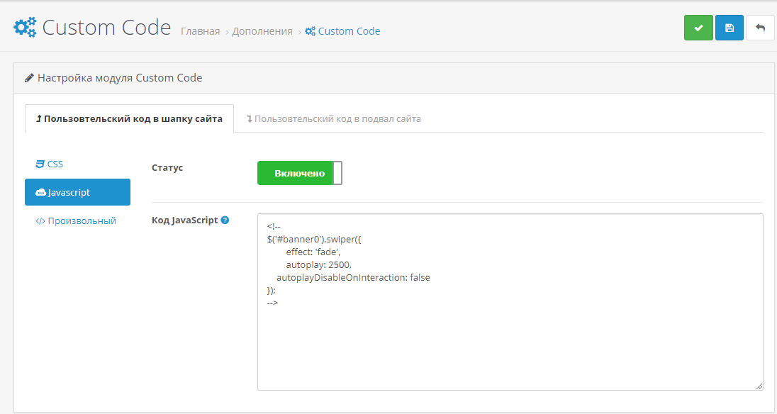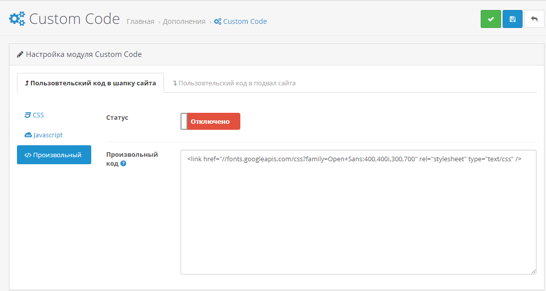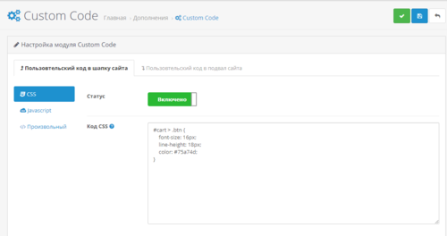 Модуль дает возможность добавить ваш код как в шапку сайта (header) - перед закрывающим тегом </head>, так и в подвал сайта (footer) - перед закрывающим тегом </body>