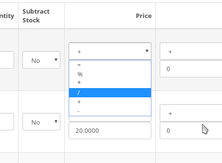 Дополнительные действия к цене опции: =, %, *,  /.