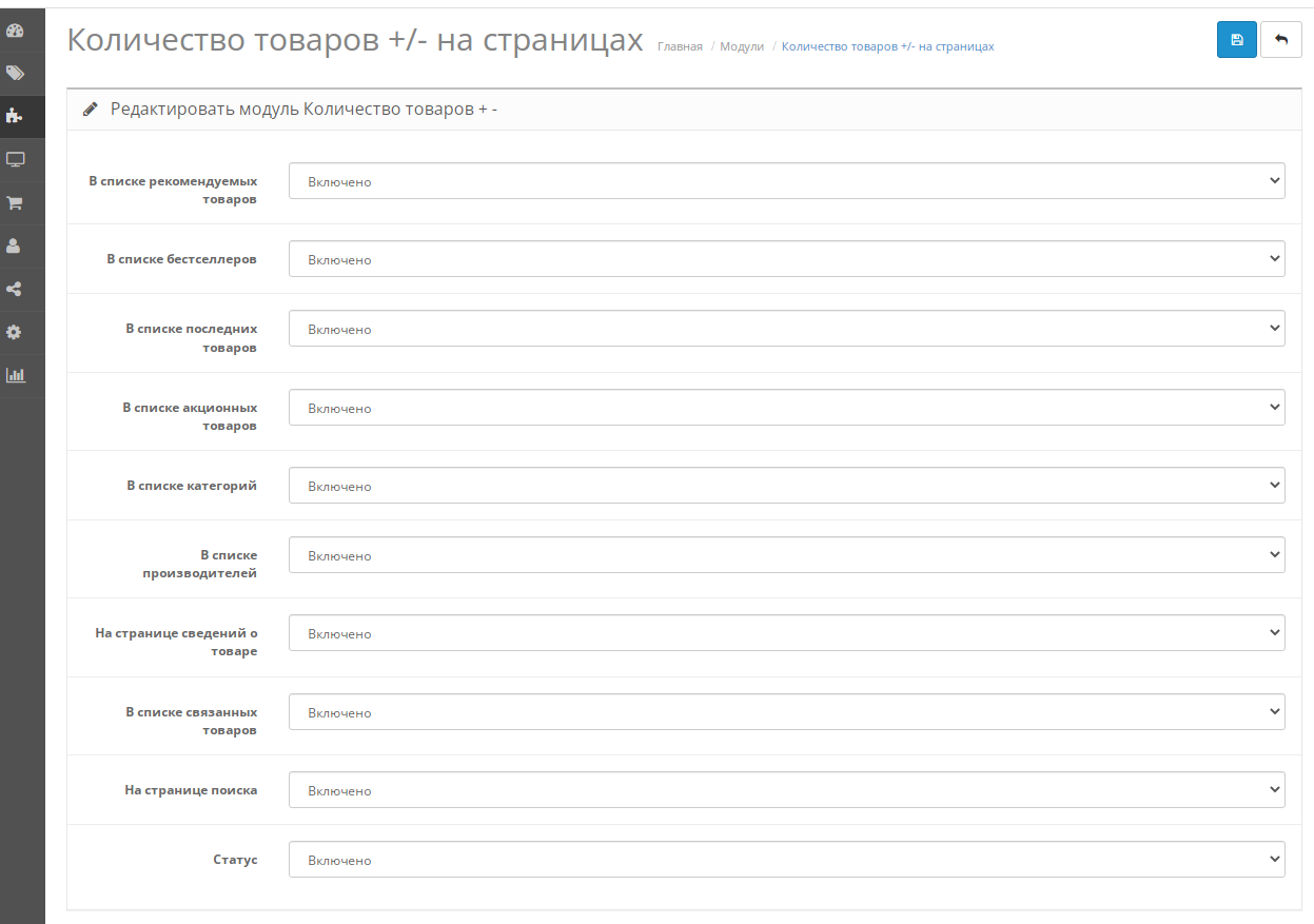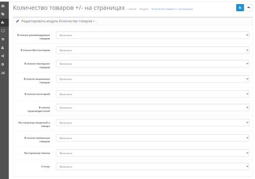 Модуль Количество товаров +/- на страницах OpenCart - возможность вывести на страницах интернет-магазина выбор количества выбранных товаров с переключение плюс/минус. Дополнение не требует никаких технических знаний. Настройка осуществляется из панели управления администратора, с выбором на каких страницах отображать увеличение и уменьшение выбора клиентами количества товаров.