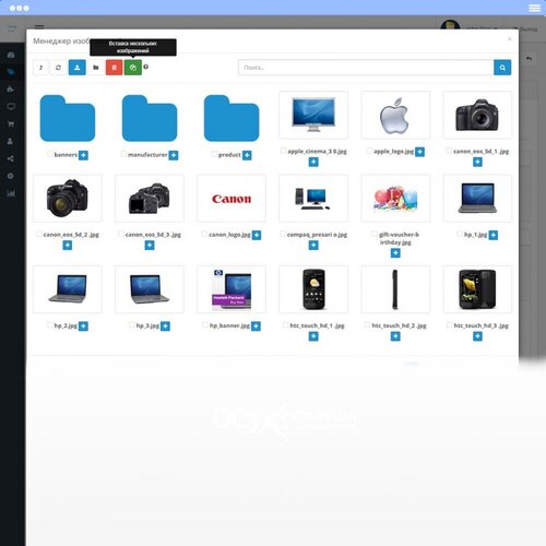 Простой менеджер изображений OpenCart 3 - расширение сэкономит вам массу труда при создании новых товаров в OpenCart 3 и вставке в них изображений. Позволяет вставить несколько изображений одновременно в редактируемый в данный момент товар, установив их с помощью флажков. Первое изображение из выбранных будет вставлено как основное, а другие как дополнительные. Вы также можете установить другое основное изображение из выбора, нажав на значок «плюс».