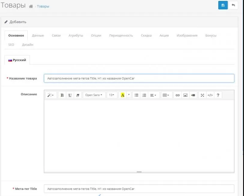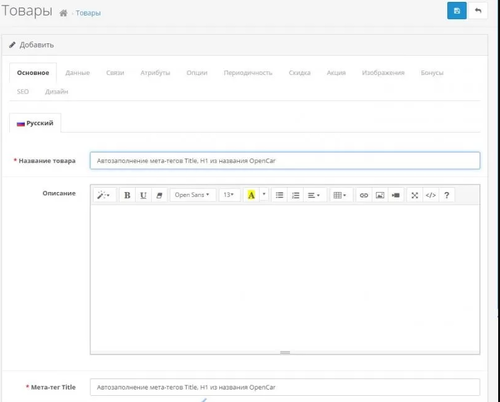 Автозаполнение мета-тегов Title, H1 из названия - расширение для интернет-магазина на OpenCart и OcStore, которое позволяет добавлять товары и категории, статьи быстрее, чем обычно - оно автоматически заполняет мета-теги Title, H1 при вводе названия товара, категории или статьи, поэтому вам не потребуется вводить во все поля их вручную. Когда вы добавляете или редактируете название страницы товара, категории или статьи, расширение автоматически заполняет мета-теги Title, H1 по мере того, как вы пишете - вы можете видеть изменения в реальном времени без перезагрузки страницы.