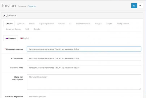 - Автозаполнение мета-тегов Title, H1 на странице товара, категорий и статей.