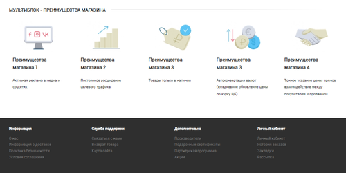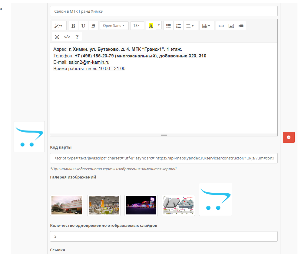 - Вставка до 5-ти дополнительных фото с функционалом увеличения по клику и просмотра набора фото из этого блока в фотогалерее fancybox, а так же карусель изображений swiper ( при использовании табличного вида ( более одного столбца)