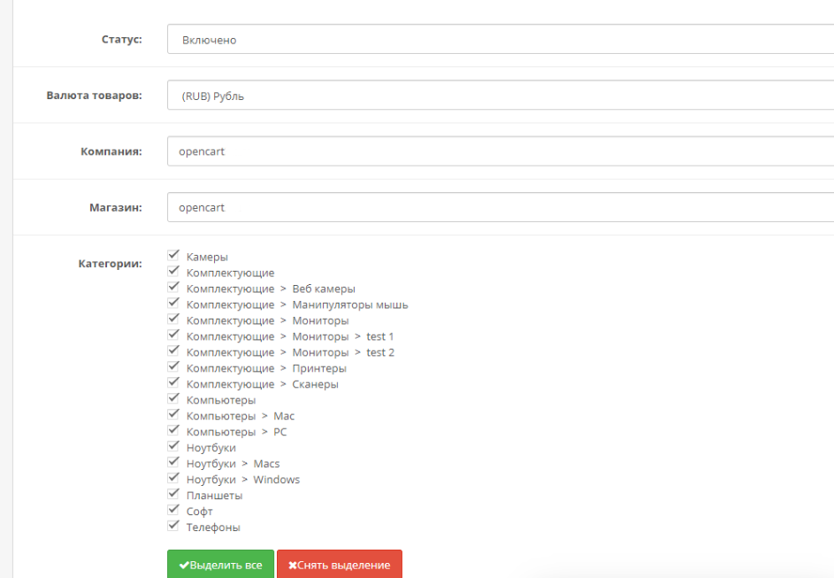 Модуль позволяет генерировать YML на основе указанных категорий, также можно задавать название магазина и номер телефона.