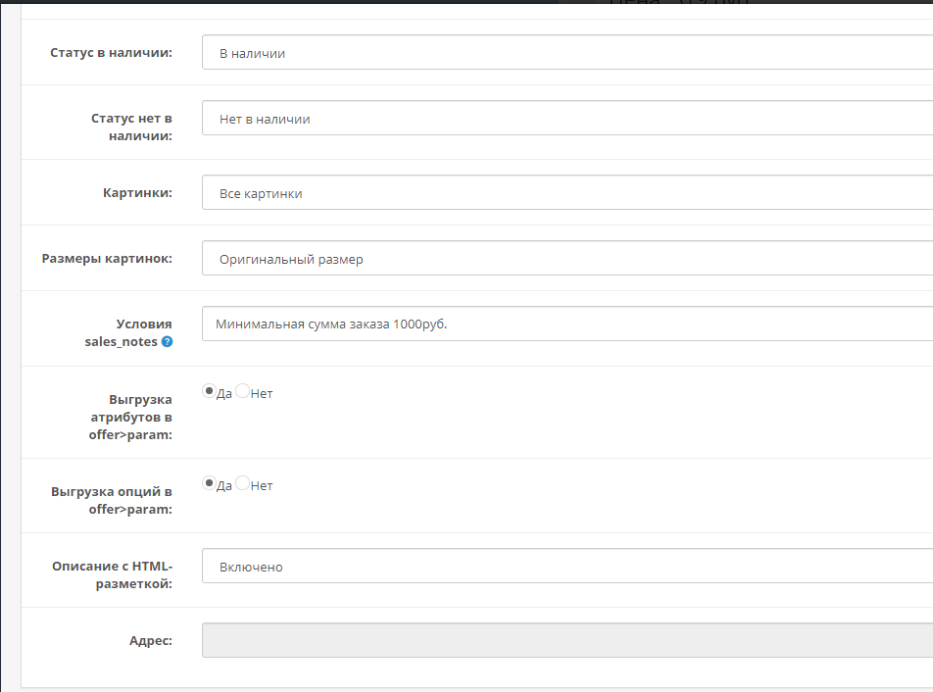 01.11.2017 - добавлено управление выгрузкой картинок, можно выбрать одну или все картинки товара выгружать. Можно выбрать размер картинок - обрезать 600x600 или оригинальный размер. Также добавлена возможность описания условий заказа - sales_notes.