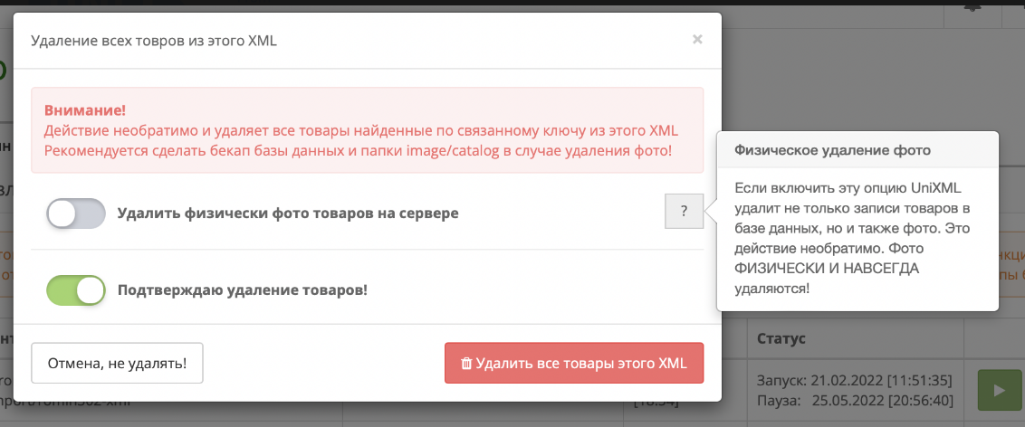 Удаление всех данных. Здесь можно выбрать что удалить: Категории, Товары, Производители, Фото товара, Атрибуты, Опции, ЧПУ (товары, бренды, категории) - в один клик.