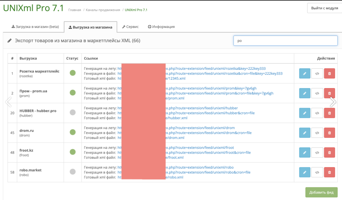 В списке маркетплейсов есть возможность сортировки перетягиванием мышки, удаления фидов, перемещения в корзину и быстрого поиска.