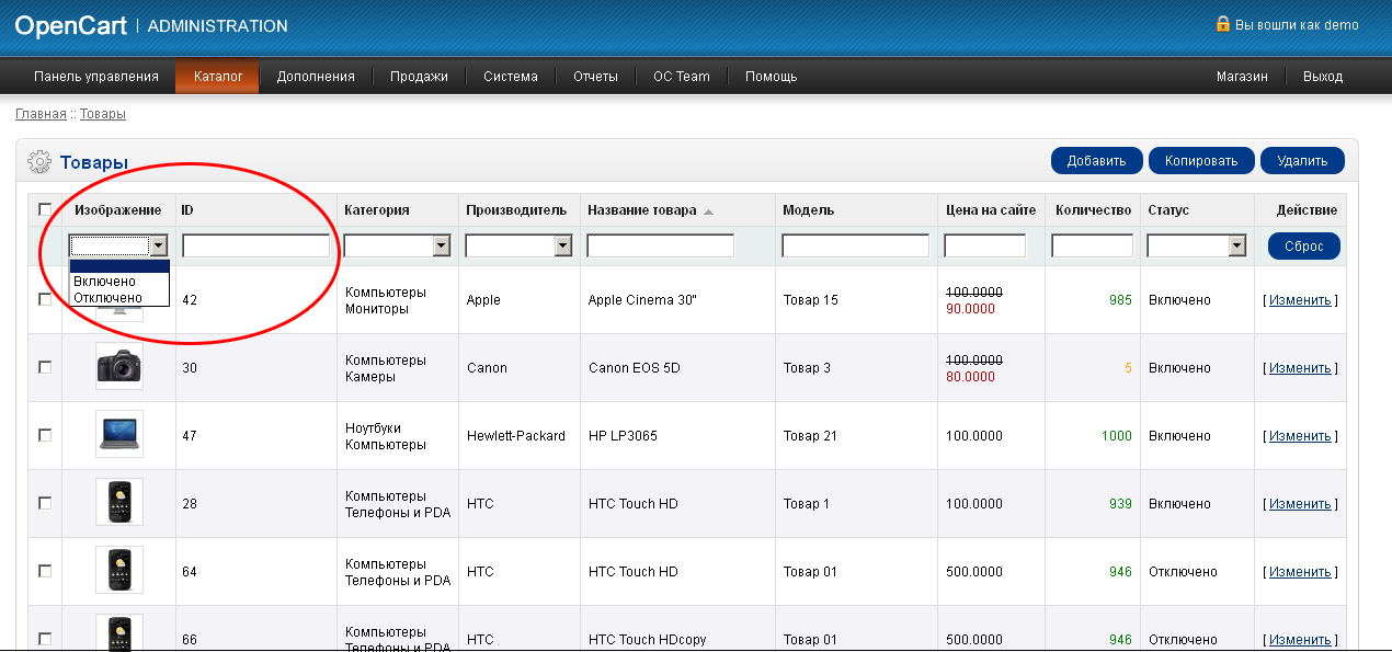 4. Перейти в Каталог > Товары (Список товаров), убедиться в работоспособности