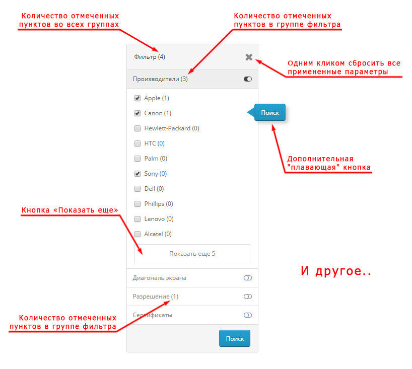- отображение количества отмеченных пунктов в группе фильтра (значение отображается в заголовке группы);