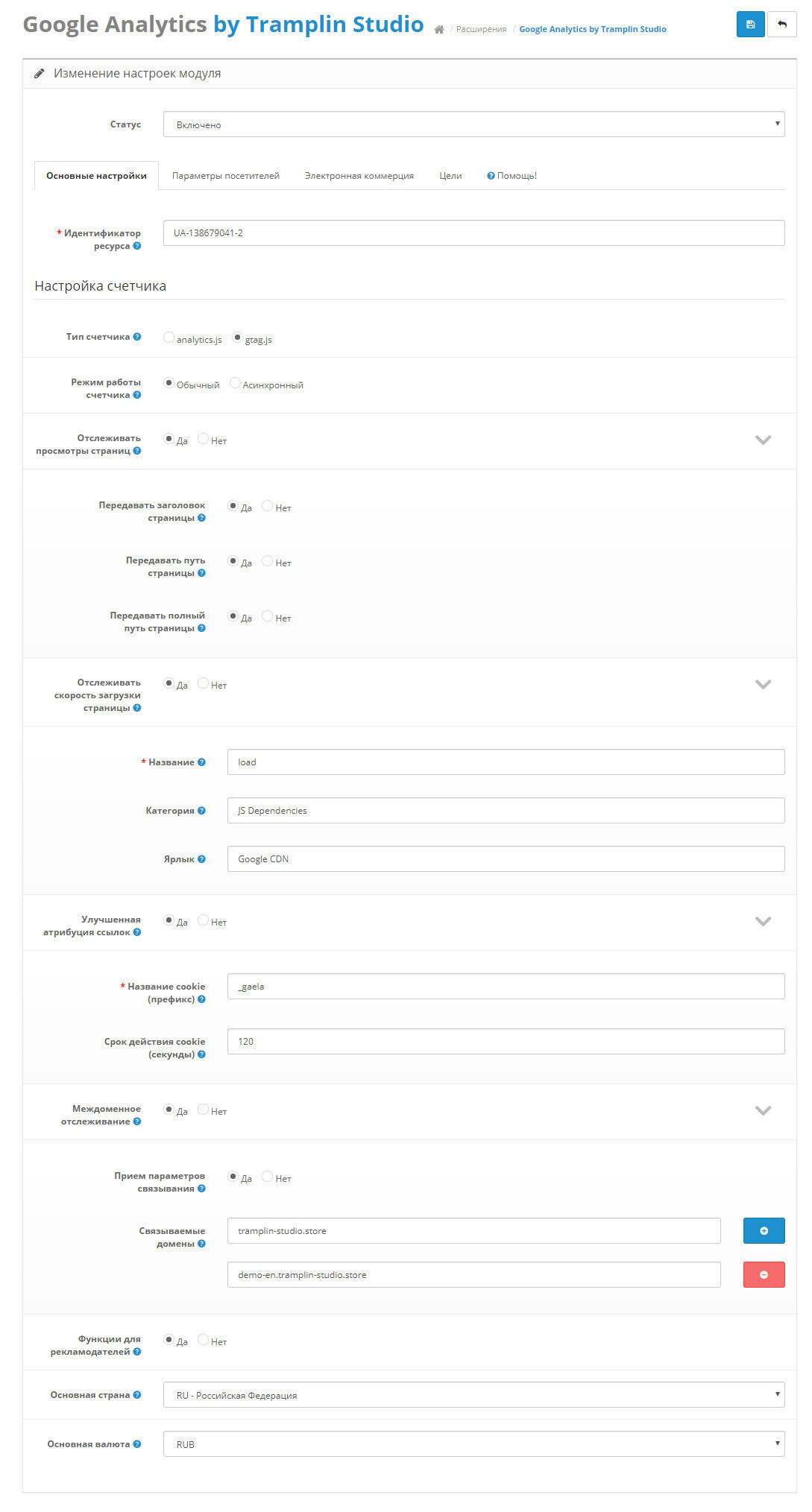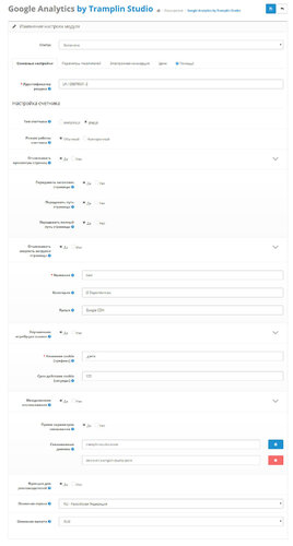 Работа с модулем начинается с создания счетчика на сайте Google Analytics. После этого, скопируйте идентификатор ресурса (номер счетчика) в настройки модуля и он сразу начнет передавать данные как о самих страницах, так и событиях, произошедших при взаимодействии с ними посетителей. В основных настройках присутствуют следующие опции: