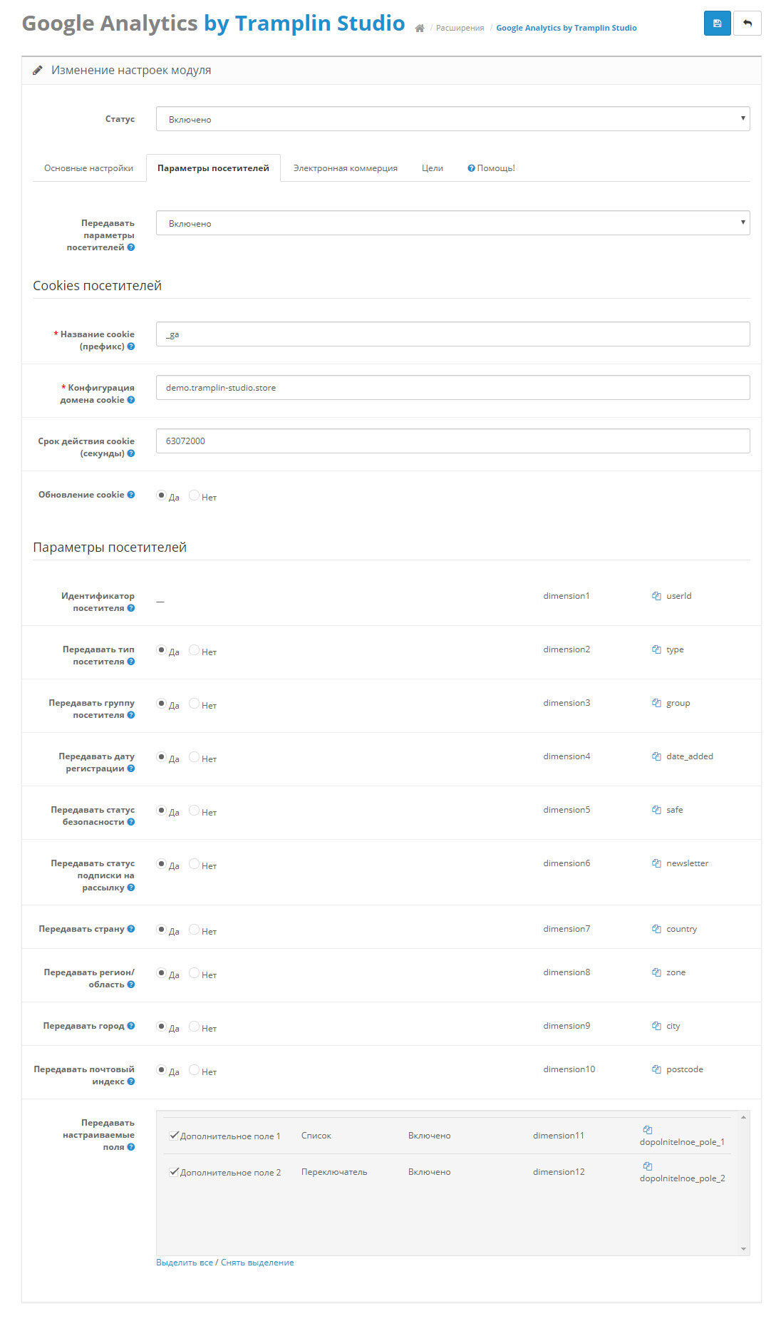 Google Analytics v1.2 by Tramplin Studio - этот модуль сам создает счетчик и передает данные интернет-магазина в инструмент веб-аналитики Google, который помогает получать наглядные отчеты, действий посетителей, отслеживать источники трафика и оценивать эффективность рекламы. Собираемые счетчиком данные обрабатываются на серверах Google и дополняются различной информацией. Но самой важной возможностью модуля является его способность очень просто настраивать и передавать данные о достигнутых целях, данные электронной коммерции (eCommerce) и развернутые данные о посетителях. С помощью этих инструментов вы сможете значительно повысить конверсию вашего интернет-магазина, что положительно скажется на ваших доходах.