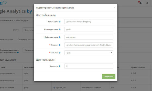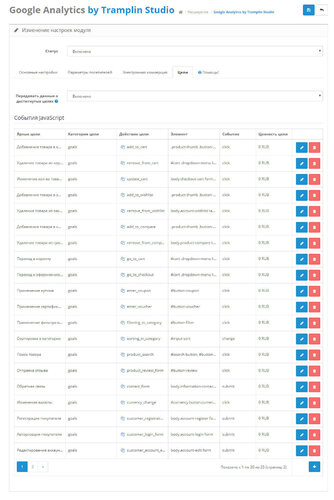 После установки модуля, вам сразу будет доступно 25 готовых целей и останется лишь скопировать их идентификаторы в настройки на сайте Google Analytics. Однако, если у вас установлен нестандартный шаблон или другие модули влияющие на верстку сайта, то некоторые цели могут не работать и потребуют перенастройки.