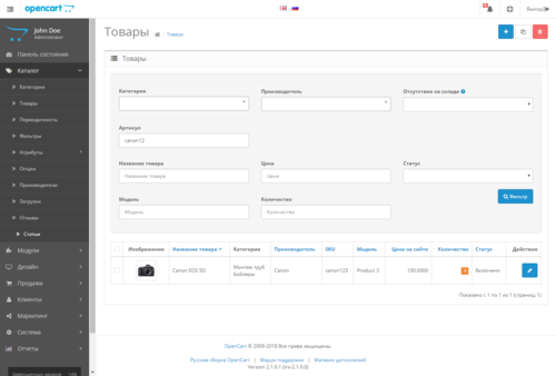 Также Вы можете включить/отключить показ колонок и фильтрации по "Категориям", "Производителям", "Отсутствию на складе" (stock_status_id), и Артиклу (SKU).