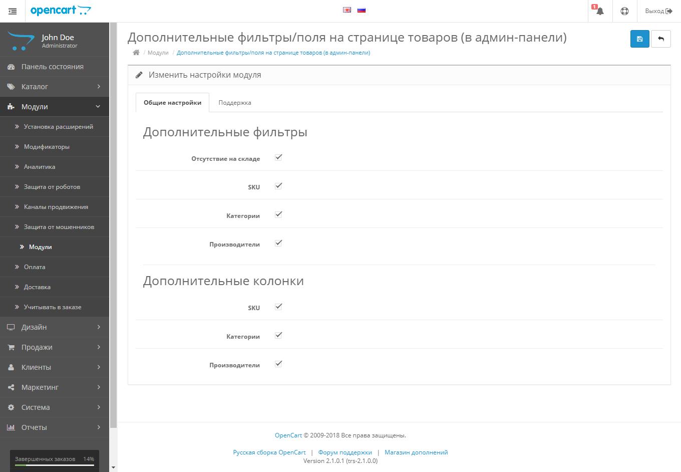 4) Перейдите в раздел "Модули", активируйте модуль "Отображение дополнительных фильтров на странице товаров", выберите необходимые настройки.