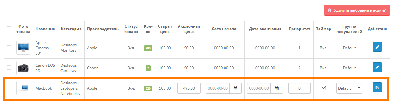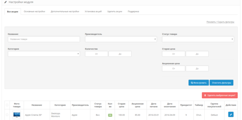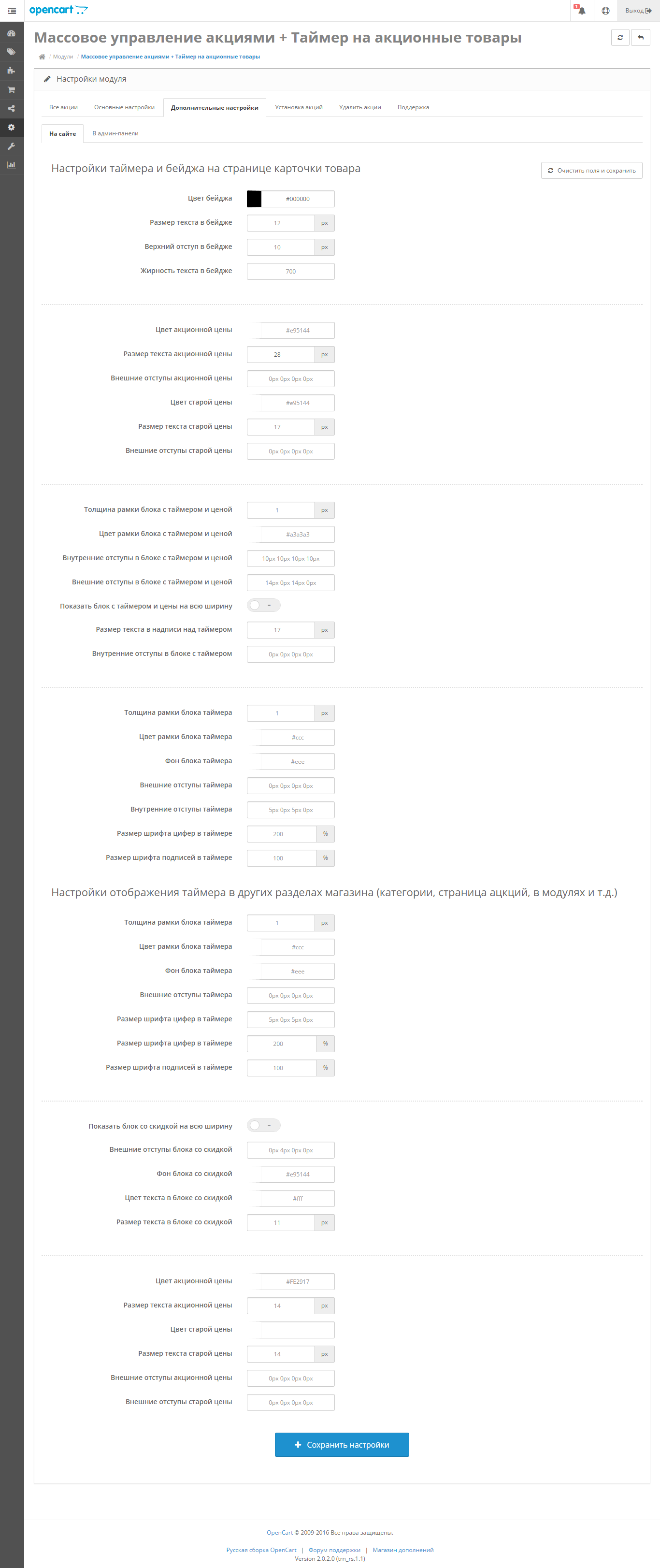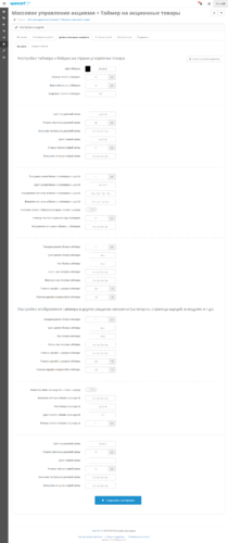 Модуль позволяет управлять всеми акциями, создавать/изменять/удалять акции. Также позволяет включить отображение таймера на акционных товарах.